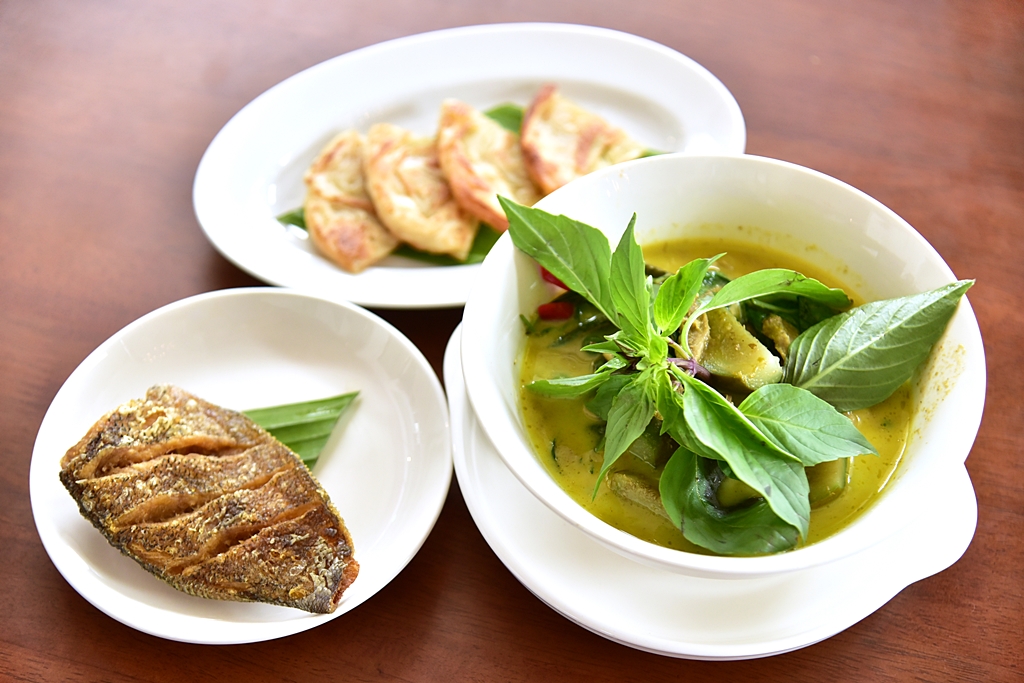 3. Green Curry with Pork served with Roti and Fried Gourami Fish (220 THB) – เมนูเด่นของ “จานเขียวหวาน” กับแกงเขียวหวานหมูรสชาติเข้มข้นเต็มรสเครื่องแกงและกะทิทานคู่กับปลาสลิดทอดกรอบทั้งตัวและโรตี (สามารถเปลี่ยนโรตีเป็นข้าวหรือขนมจีนได้ครับ)
