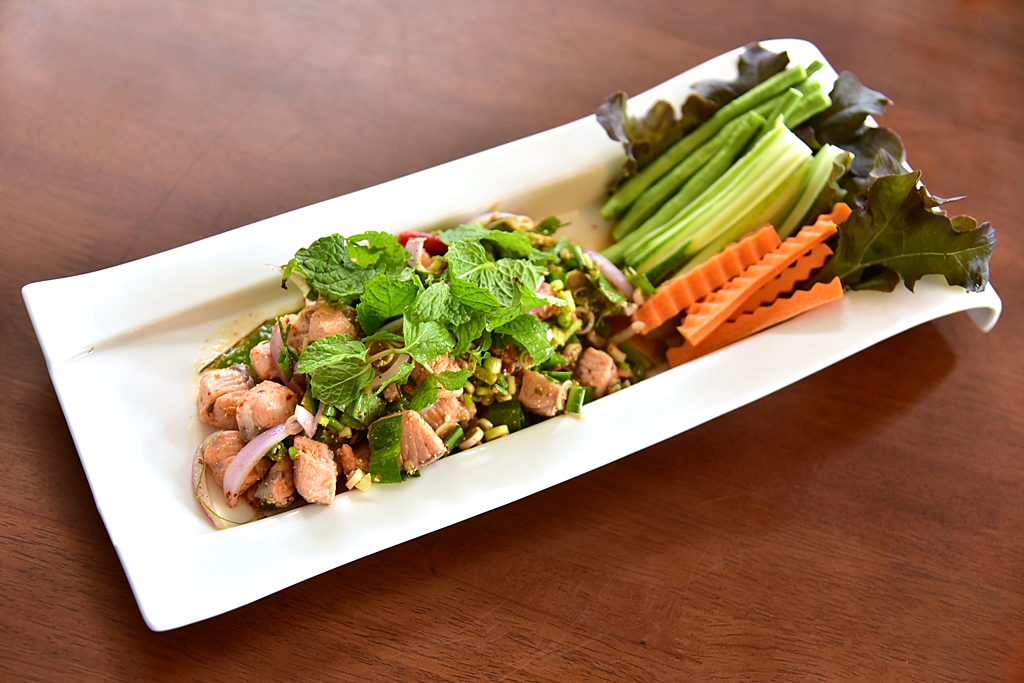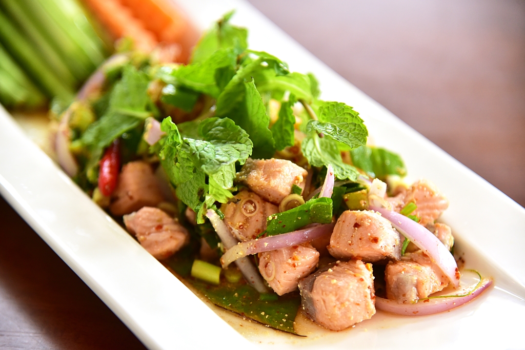 2. Lime & Chilli Salmon (280 THB) – พล่าปลาแซลม่อนแบบสุกรสชาติแบบไทยๆ