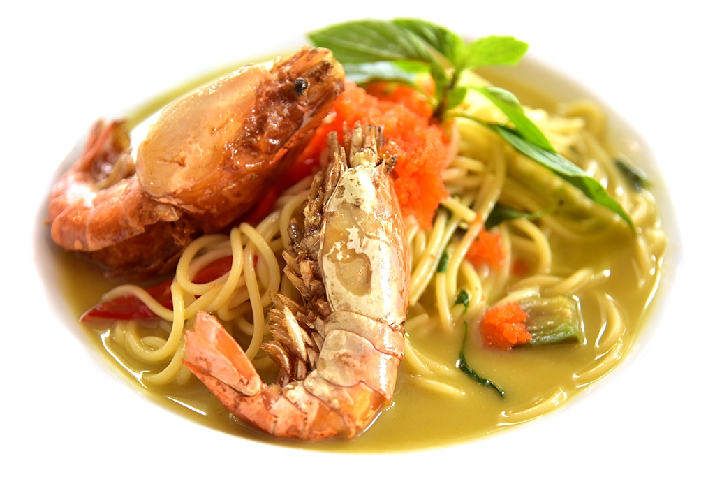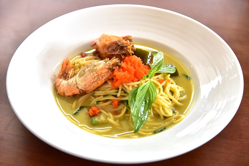 5. Spaghetti with King Prawn mixed with Green Curry (280 THB) – สปาเก็ตตี้ในซอสแกงเขียวหวานแบบนุ่มละมุนเสิร์ฟพร้อมกับกุ้งลายเสือทอดและไข่ปลาบิน กลิ่นของกุ้งและความเค็มมันของไข่ปลาบินทำให้ซอสแกงเขียวหวานอร่อยขึ้นครับ