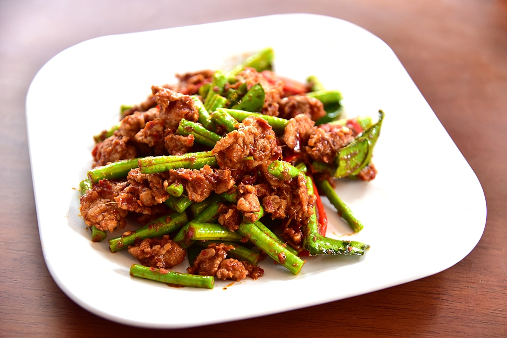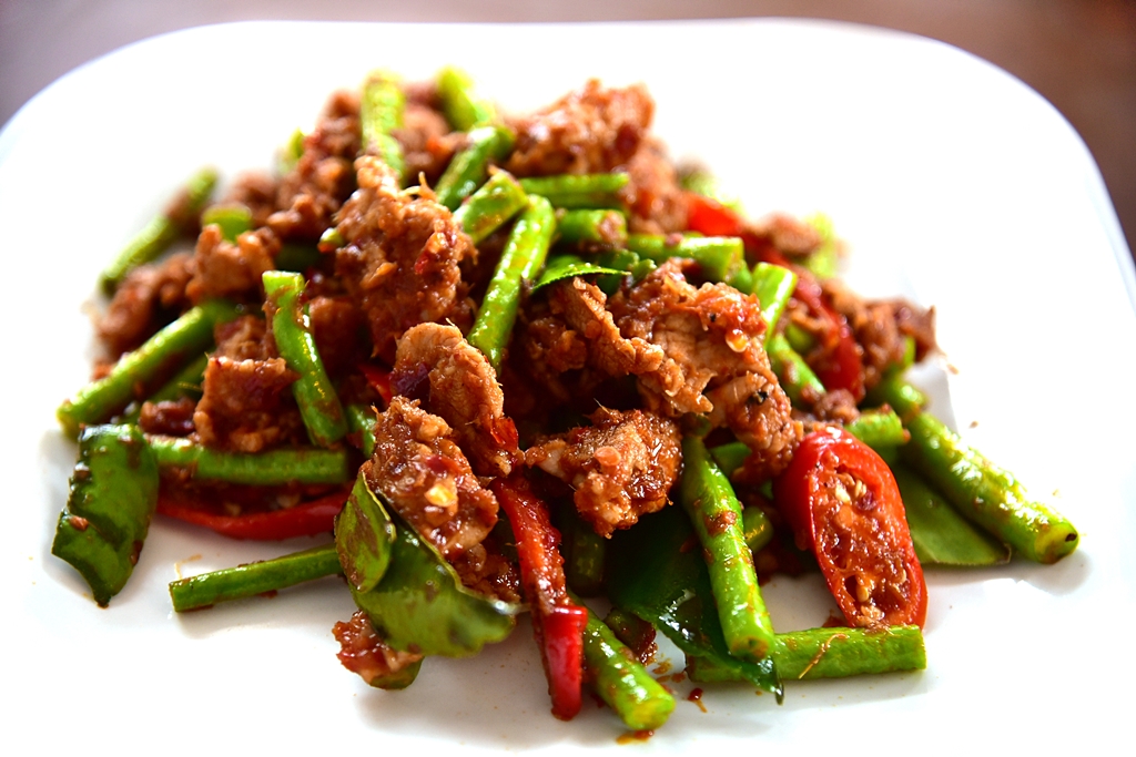 4. Stir Fried Pork with Chilli and Ginger (180 THB) – หมูผัดพริกขิงกับถั่วฝักยาวรสชาติเข้มข้นพร้อมกลิ่นเครื่องแกงที่หอมฟุ้งเป็นพิเศษ