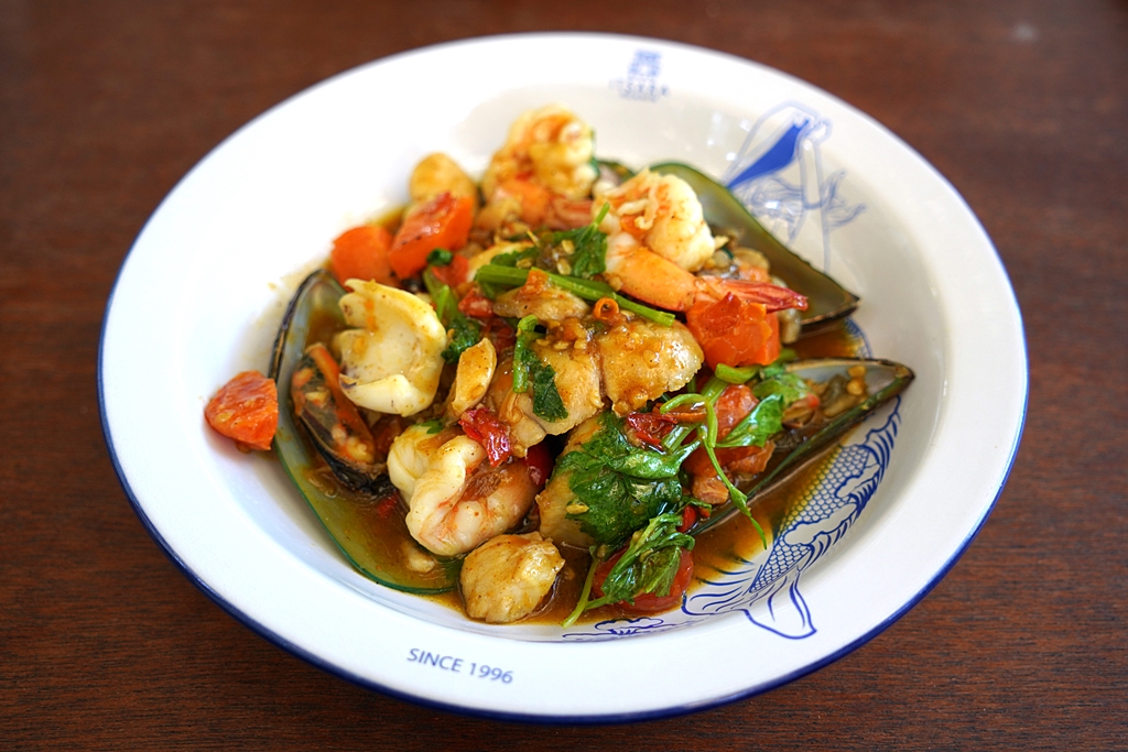 6. Stir-Fried Mixed Seafood with Yellow Curry and Salted Egg (380 THB) [12/20] – “ผัดเรือรบไข่เค็ม” ที่รวบรวมอาหารทะเลทั้งกุ้ง ปลา ปลาหมักและหอยแมลงภู่มาผัดกับซอสผงกะหรี่และไข่เค็ม