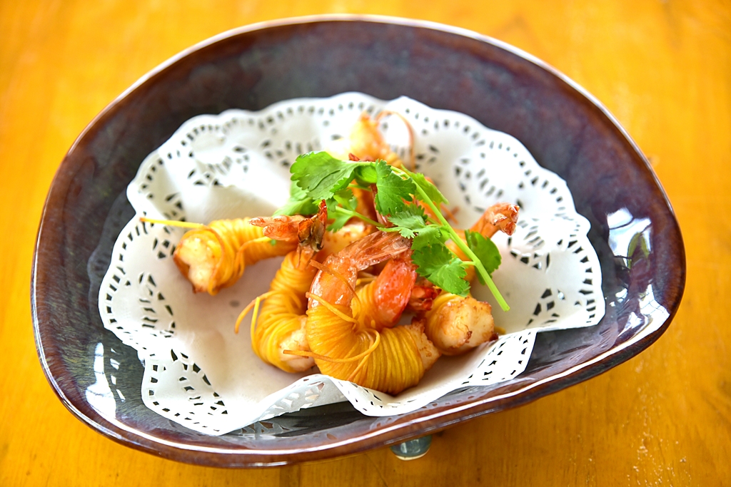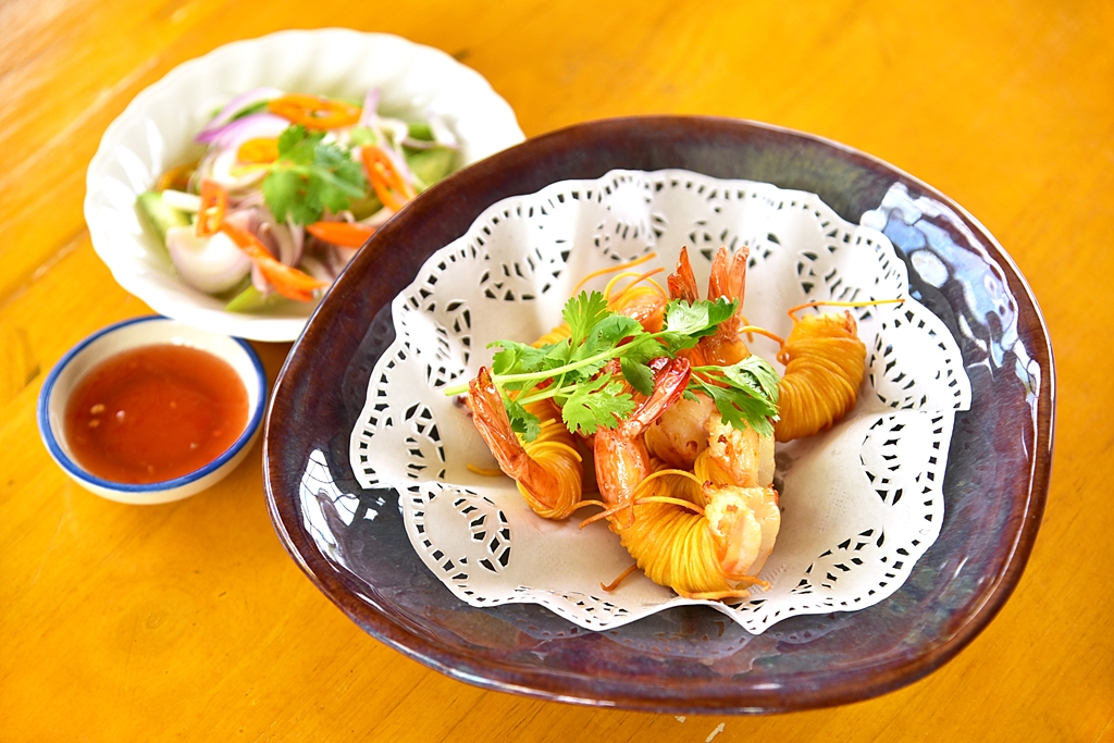 2. กุ้งสร่ง (189 THB) – กุ้งสดห่อหุ้มด้วยเส้นบะหมี่ชุบแป้งทอดกรอบเสิร์ฟคู่กับอาจาดและน้ำจิ้มไก่