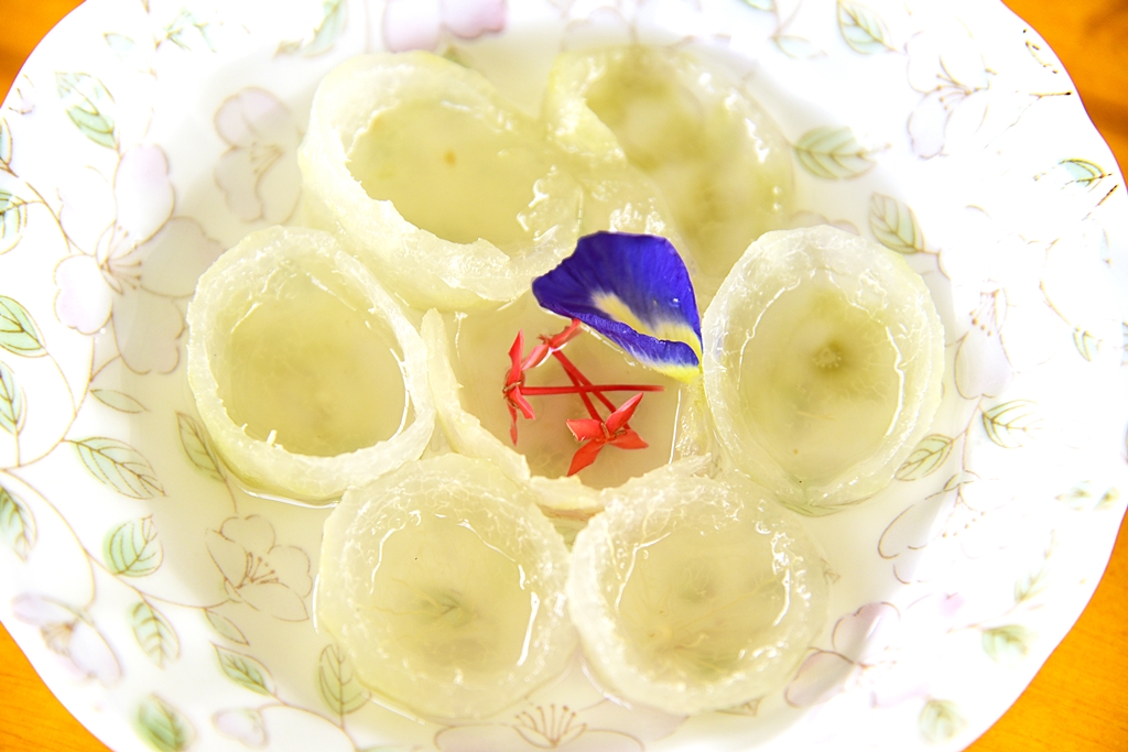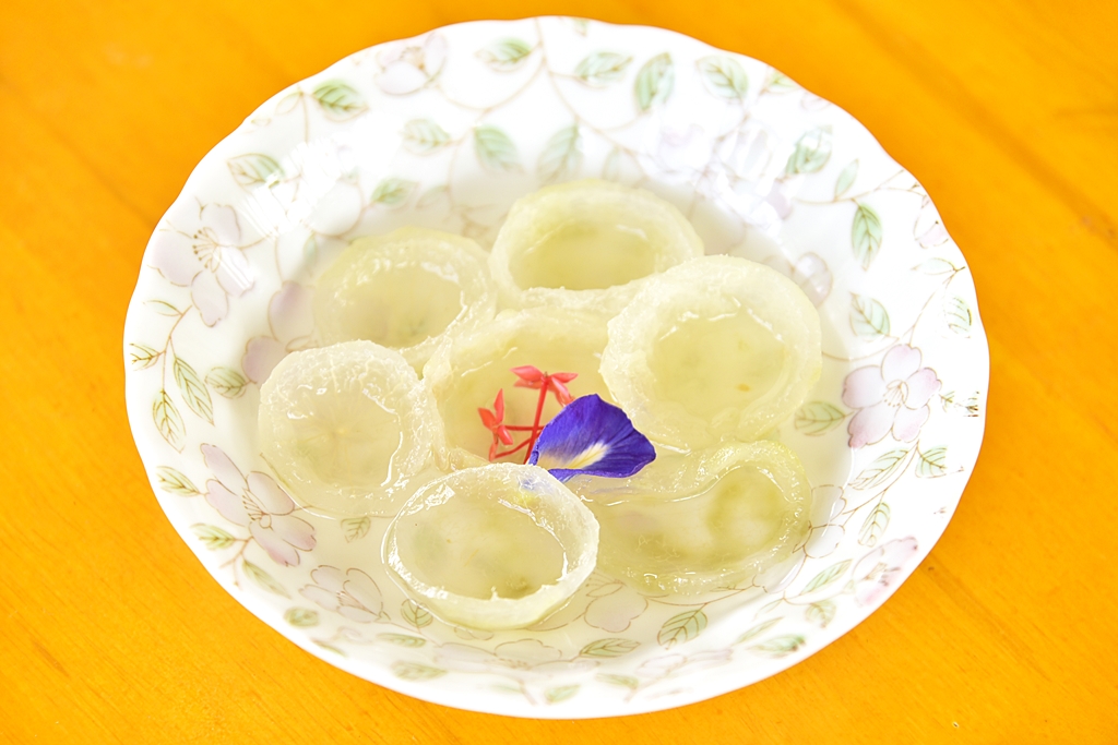 8. มะกรูดลอยแก้ว (59 THB) – เนื้อส่วนเปลือกมะกรูดลอกผิวสีเขียวออกก่อนนำไปลอยแก้วให้หวานนุ่ม เป็นเมนูที่หาทานได้ยากมาก