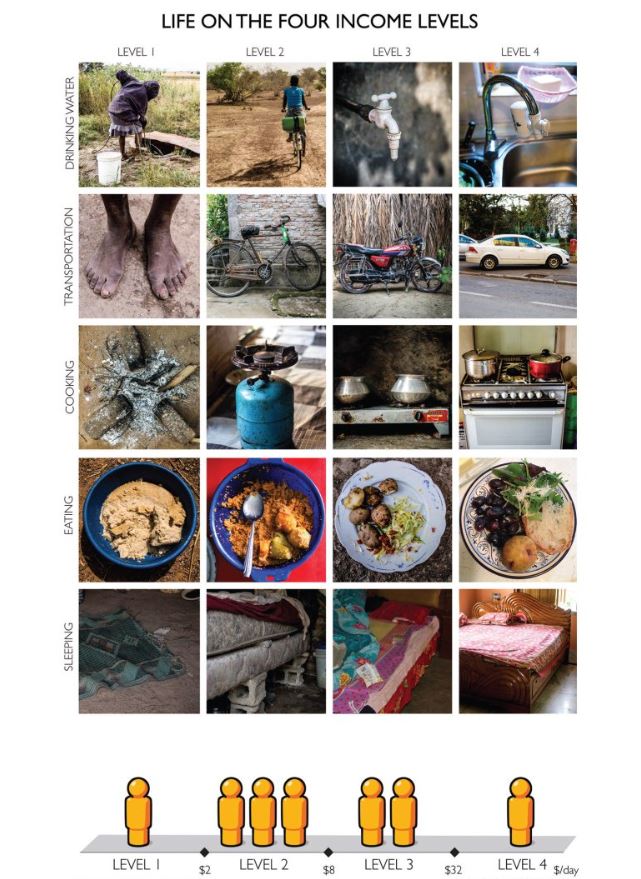 การศึกษาข้อเท็จจริงทางสถิติของสถานการณ์โลกในปัจจุบันอย่างครบสมบูรณ์ได้ทำให้ผู้เขียนเลือกที่จะแบ่งระดับฐานะความเป็นอยู่ของประชากรโลกออกเป็น 4 ระดับที่สะท้อนให้เห็นถึงสภาพความเป็นจริงของปัจจุบันตามรูปภาพด้านล่าง