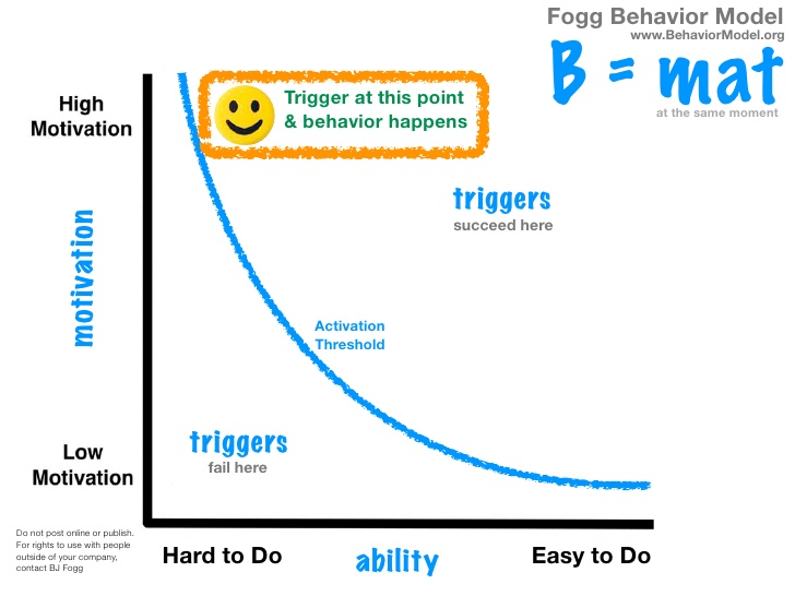 Action หรือ “การลงมือทำ” ของผู้ใช้งานตามทฤษฎี The Fogg Behavior Model นั้นจะต้องประกอบด้วย 3 ปัจจัย ได้แก่ Trigger, Motivation และ Ability เช่น การรับโทรศัพท์จะเกิดขึ้นก็ต่อเมื่อมีการสั่น (trigger), โทรศัพท์อยู่ในจุดที่เข้าถึงได้ง่าย (ability) และเจ้าของอยากรับโทรศัพท์นั้น (motivation)