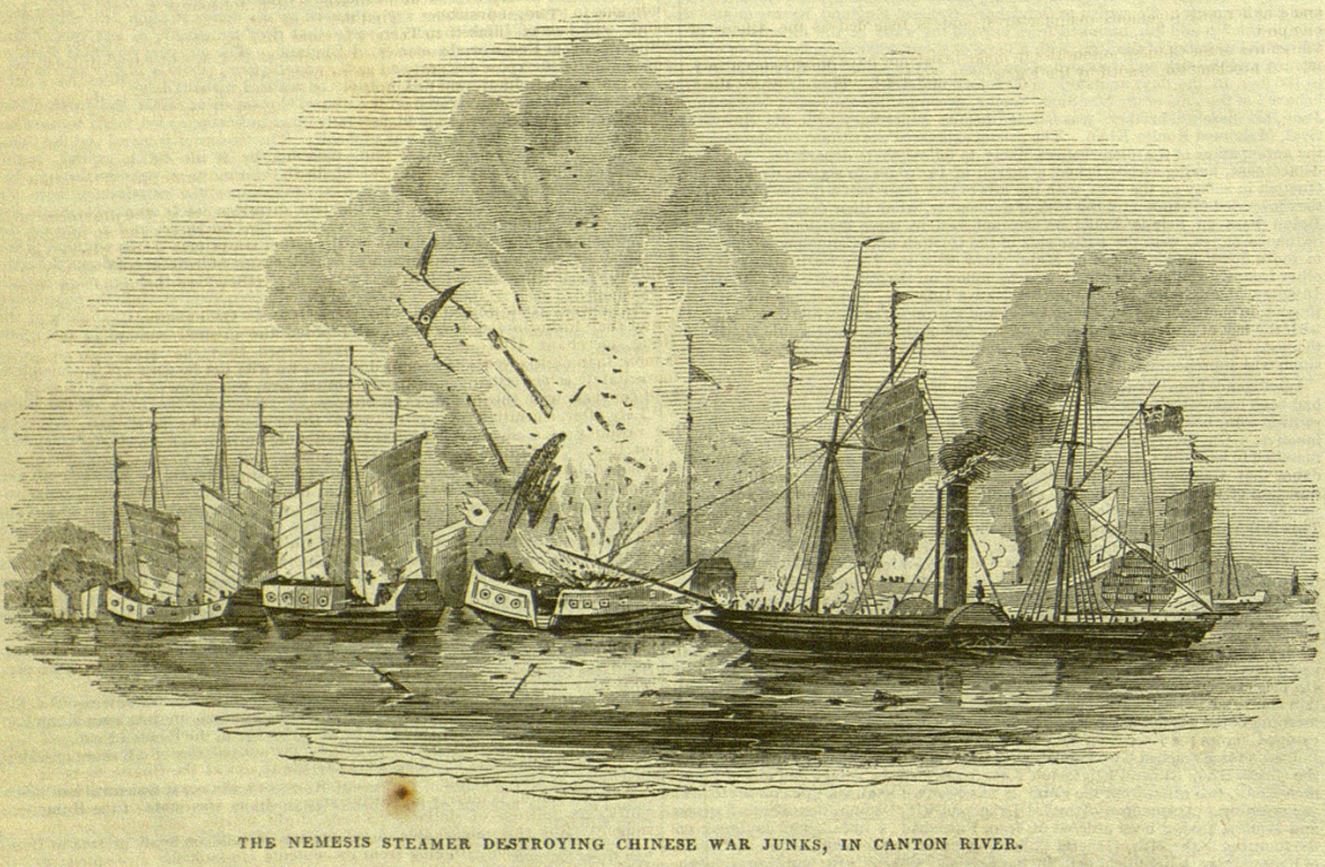 ภาพจำลองการทำลายกองเรือไม้ของจีนโดยเรือ Nemesis ของอังกฤษในสงครามฝิ่น (ขอบคุณภาพจาก Wikipedia)