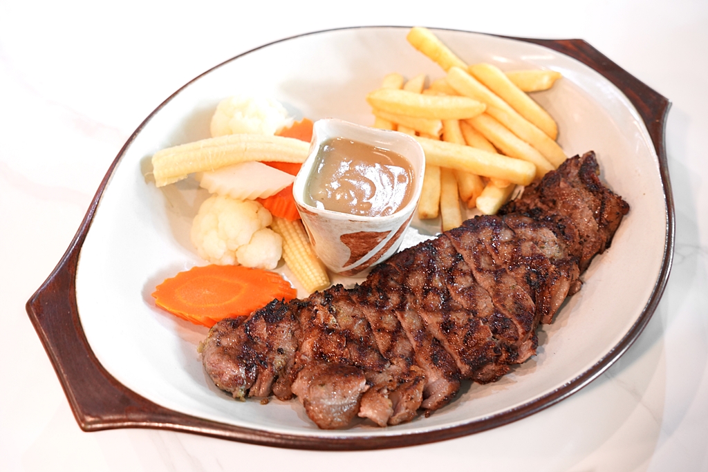6. Rib Eye Steak (690++ THB) [12/20] – สเต็กเนื้อริบอายชิ้นโตเสิร์ฟคู่กับซอสเกรวี่ เฟรนช์ฟรายส์และผักต้ม ตัวชิ้นสเต็กที่ได้มาเอ็นแอบเยอะไปหน่อยครับ