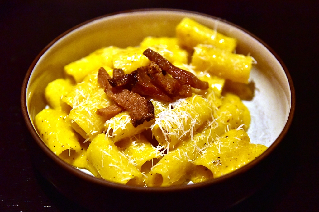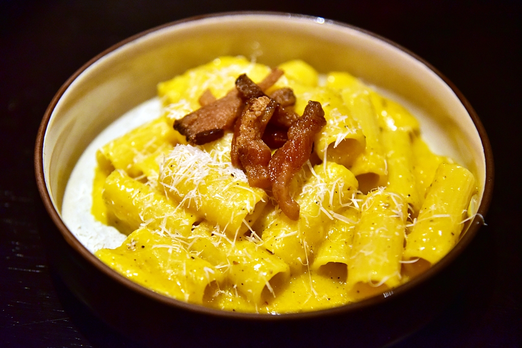 6. Carbonara Roman-style with Cured Pork Cheek, Pecorino Romano & Egg Yolk (350+ THB) – ริกาโทนี่คาร์โบนาร่าสไตล์โรมันรสชาติเข้มข้นเสิร์ฟคู่กับแก้มหมูทอดรสเค็มเข้ากัน