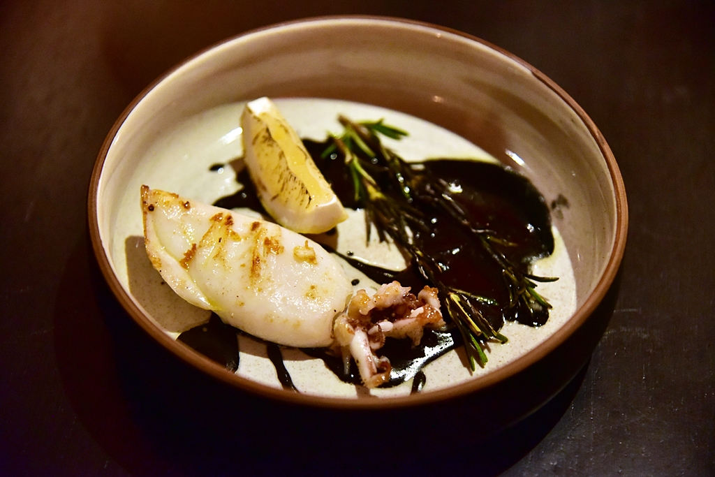 2. Smoked Grilled Squid, Black Ink Sauce, Rosemary (290+ THB) – ปลาหมึกย่างรมควันเนื้อนุ่มหอมเสิร์ฟในซอสหมึกดำรสกลมกล่อมคู่กับโรสแมรี่และเลม่อน