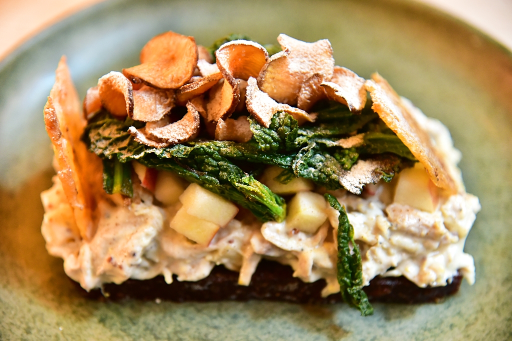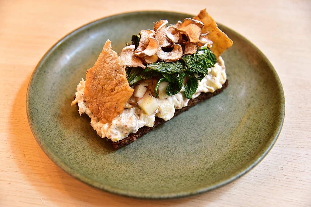 5. Chicken Salad with jerusalem artichokes, apples, oyster mushrooms, black kale and crispy chicken skin (125 DKR) – ขนมปังปิ้งหน้าสลัดเนื้อไก่ เห็ดหอยนางรม เคล แอปเปิ้ลและหนังไก่ทอดกรอบ