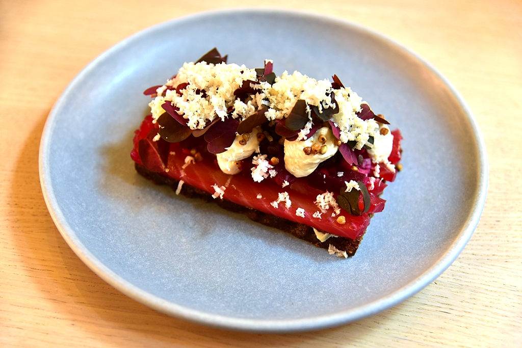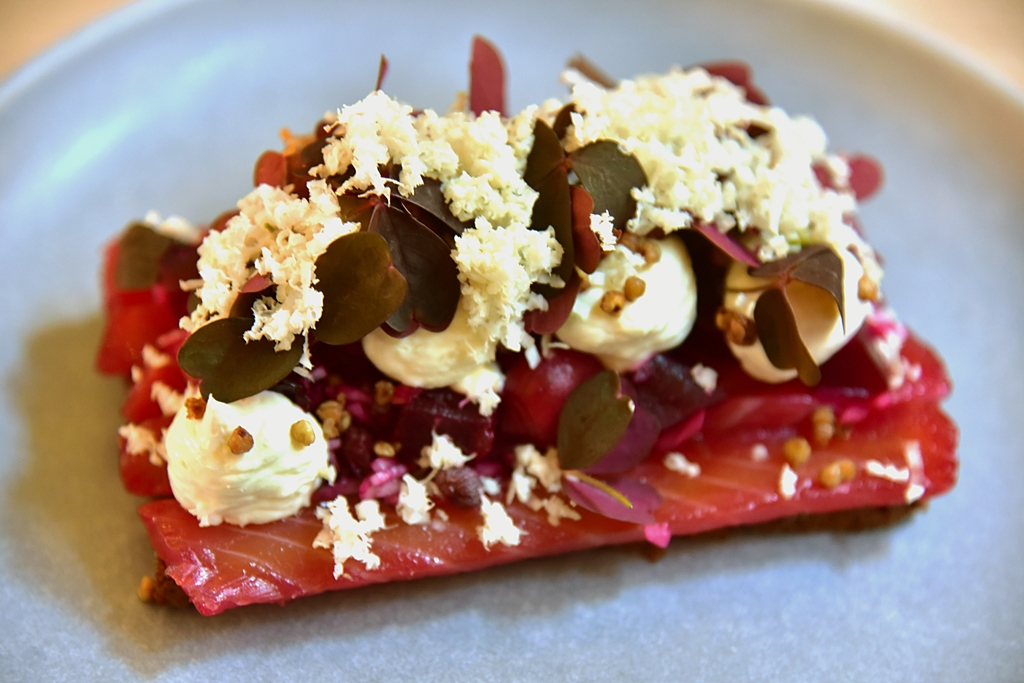 3. Cured Salmon with smoked beetroots, blackcurrants, horseradish and sorrel (140 DKR) – ขนมปังปิ้งหน้าแซลม่อนบ่มกับบีทรูทรมควันสีแดงเสิร์ฟคู่กับฮอร์ชราดิชรสเผ็ดและแบล็คเคอร์แรนท์