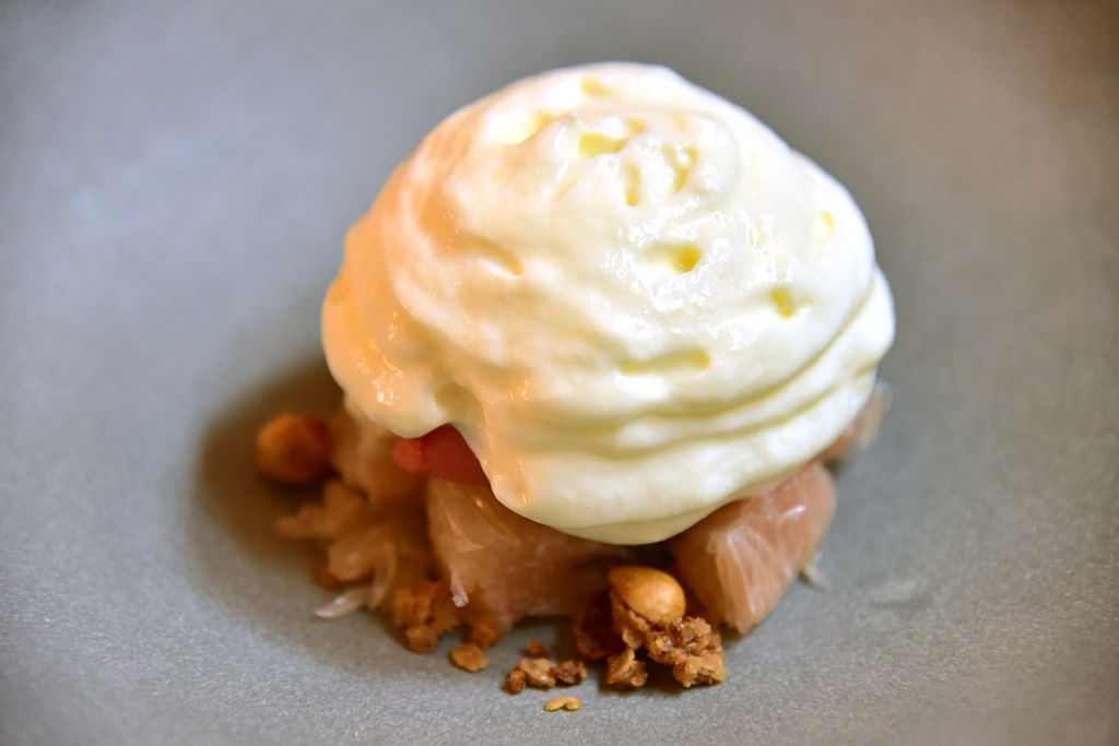 8. Lemon Mousse with granola, blood orange and tarragon (95 DKR) – มูสเลม่อนรสเปรี้ยวสดชื่นเสิร์ฟคู่กับส้มบลัดออเรนจ์