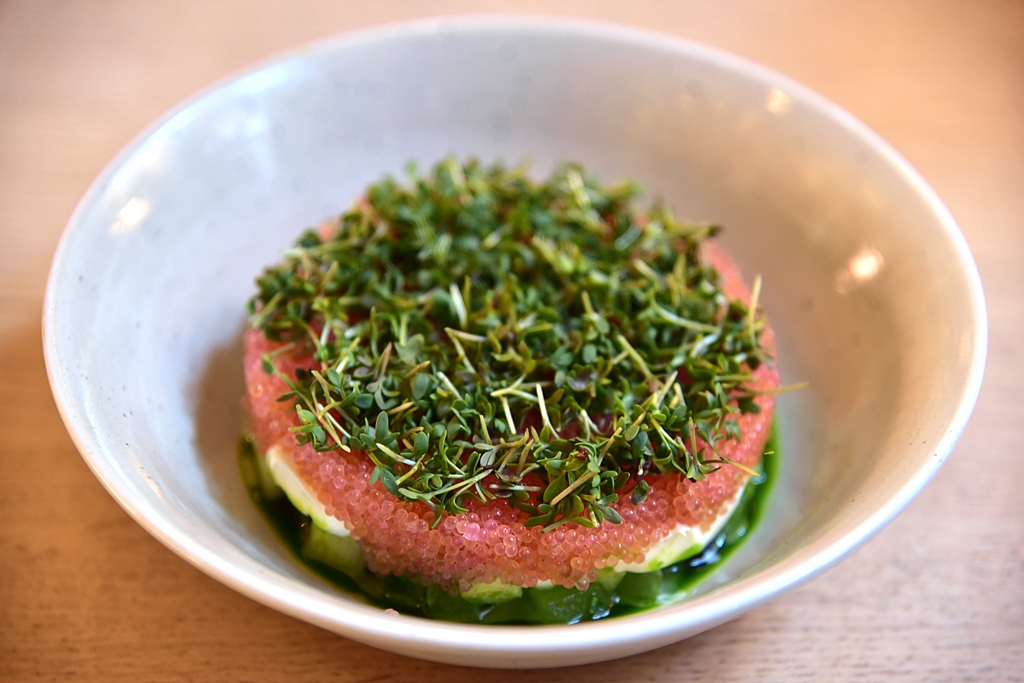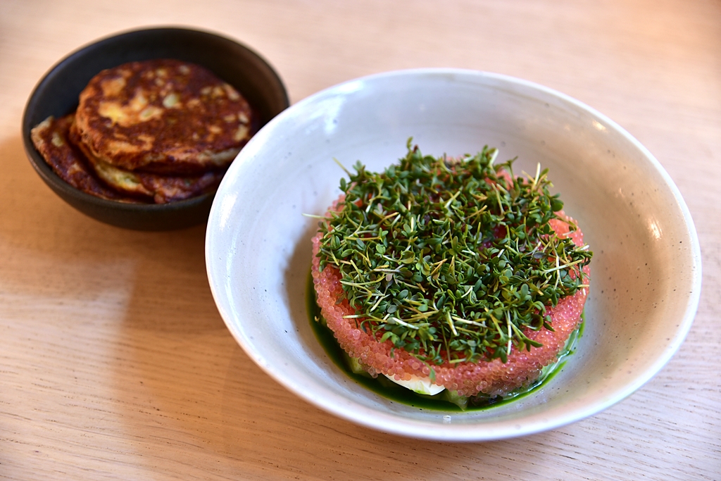 1. Lumpfish Roe with ramsons, kohlrabi, creme fraiche and potato blinis (125 DKR) – ไข่ปลาลัมป์ฟิชสีชมพูใสเสิร์ฟกับซอสครีมเปรี้ยวหอมมันและซอสผัก kohlrabi สะกัด ทานคู่กับแพนเค้กมันฝรั่ง