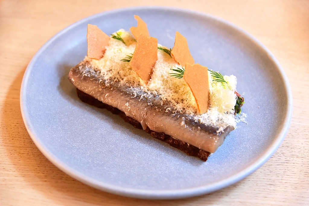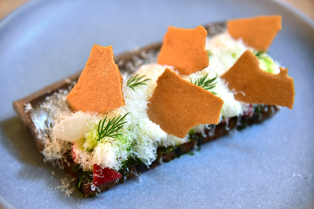 2. Marinated Herring with elderflower, creme fraiche, pickled onions, apples and cheese (105 DKR) – ขนมปังปิ้งหน้าปลาแฮริ่งดองกับเอลเดอร์ฟลาวเวอร์โรยหน้าด้วยครีม แอปเปิ้ลและชีสกรอบ