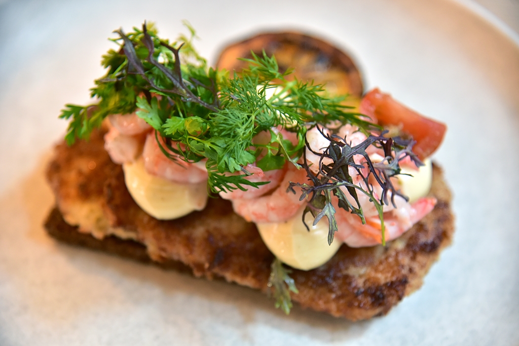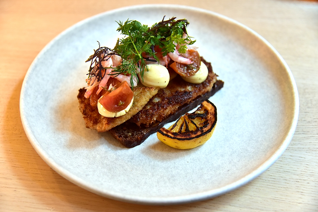 4. Pan-fried Plaice with hand-peeled shrimps, chamomile, pickled tomatoes and charred lemon (155 DKR) – ขนมปังปิ้งหน้าเนื้อปลาตาเดียวชุบแป้งทอดเนื้อฉ่ำและกุ้งหวานสดเนื้อเด้ง