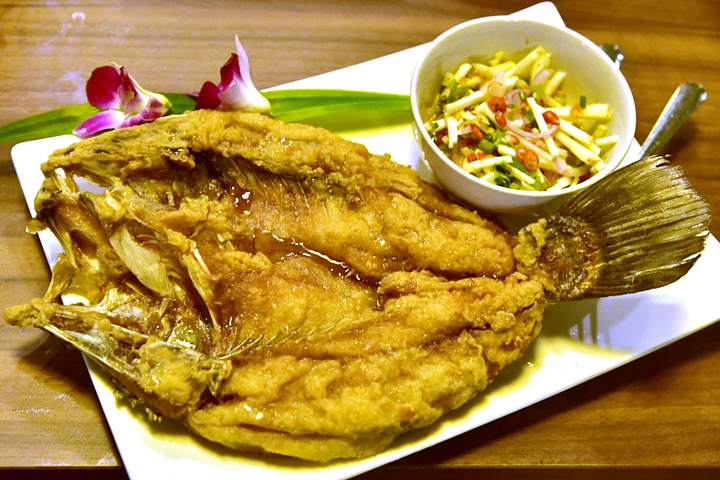 7. Deep Fried Sea Bass with Spicy Mango Sauce (360 THB) – ปลากระพงทอดน้ำปลาเสิร์ฟคู่กับยำมะม่วง