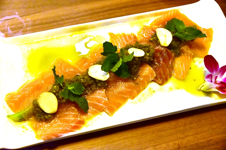 4. Sliced Salmon with Spicy Seafood Sauce (230 THB) – แซลม่อนดิบเสิร์ฟคู่กับซอสซีฟู้ดหอมกลิ่นโหระพา