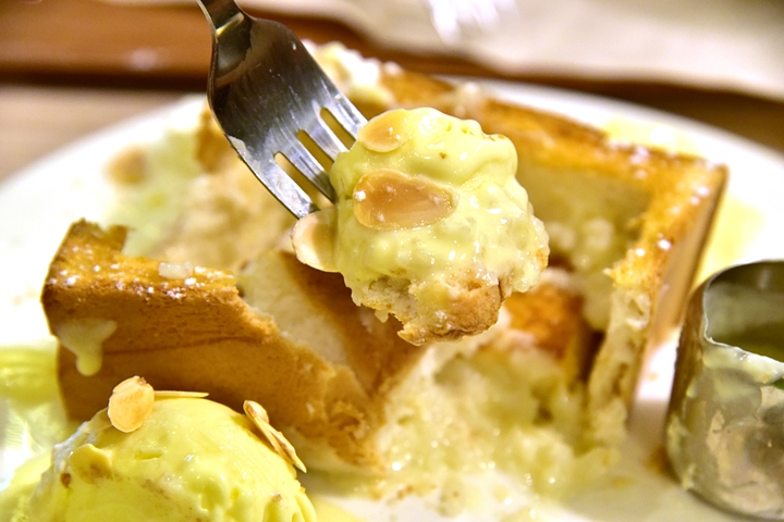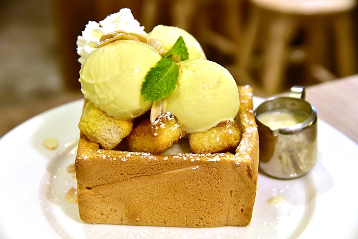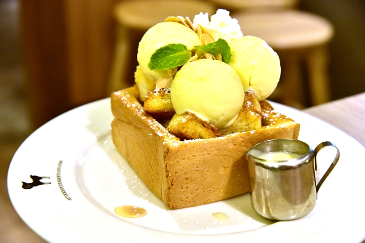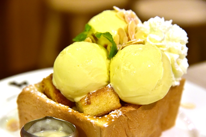 1. Durian Sticky Rice Toast (325 THB) – ขนมปังชิบูย่าโทสต์ไส้ข้าวเหนียวทุเรียนเสิร์ฟคู่กับไอศกรีมทุเรียนและซอสทุเรียนรสเข้มข้น