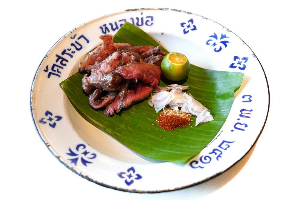 3. Grilled Thai Wagyu Rib Finger (390++ THB) [17/20] – เนื้อไทยวากิวส่วนร่องซี่โครงย่าง 120 กรัมเสิร์ฟคู่กับแจ่วและเครื่องเคียงอีสาน ตัวเนื้อเคี้ยวสนุกเหมาะสำหรับคนชอบเนื้อแนวเสือร้องไห้ครับ
