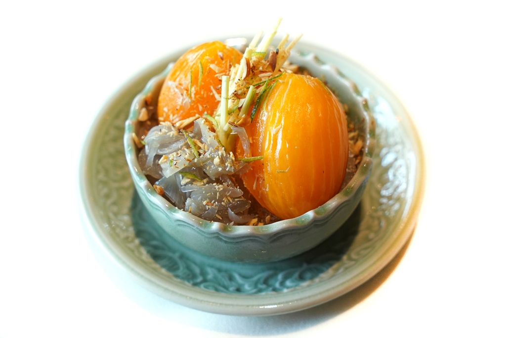 9. Marian Plum in Cytrusy Syrup with Golden Yolk Sweet (410++ THB) [14/20] – “ส้มฉุน” น้ำแข็งไสรสเปรี้ยวโรยหอมเจียวและมะปรางเสิร์ฟคู่กับขนมทองเอก