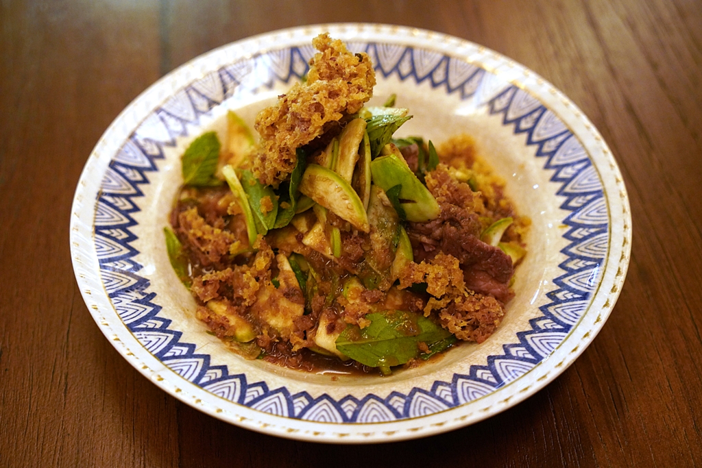 Apple Aubergine Salad with Grilled Beef and Crispy Catfish [16/20] – “ยำโต่ง” เนื้อริบอายและปลาดุกฟูในน้ำยำกะปิและมะเขือยาว