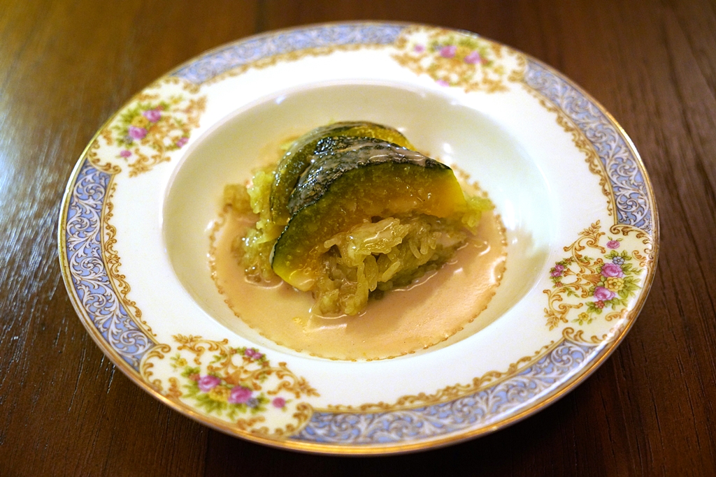 Pumpkin poached in Coconut Cream with Crunchy Jade Rice [16/20] – “บวชฟักทอง” น้ำกะทิรสเข้มข้นหอมมันเสิร์ฟบน “ข้าวเหนียวแก้ว” ที่หุงแบบไม่สุดมากนักจนได้รสสัมผัสแบบ al dente เสิร์ฟคู่กับถั่วทอด