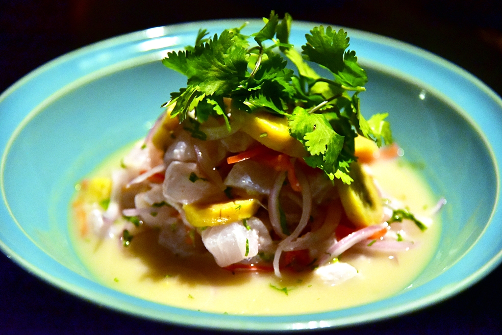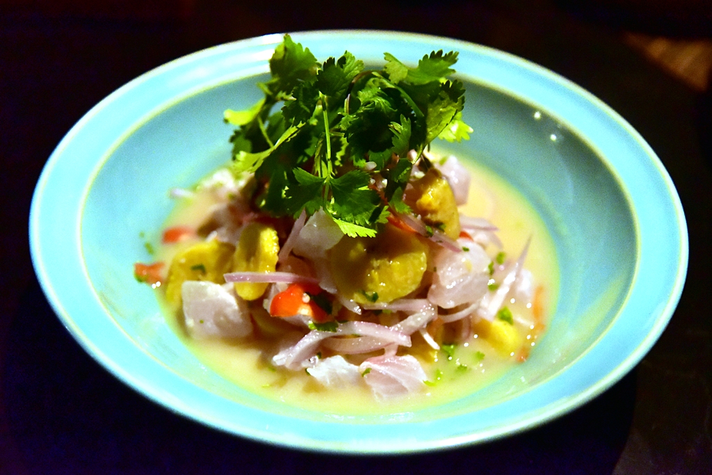 4. Ceviche Amaz Style with Cooked Ripe Plantains and Charapita Chili Pepper (80 Sol) – ปลาเนื้อขาวหั่นเต๋าในซอสยำรสเปรี้ยวสดชื่นพร้อมด้วยเนื้อกล้วยหั่นแว่น หอมแดงและพริกเปรู
