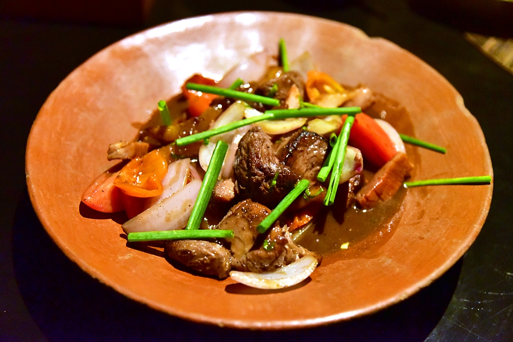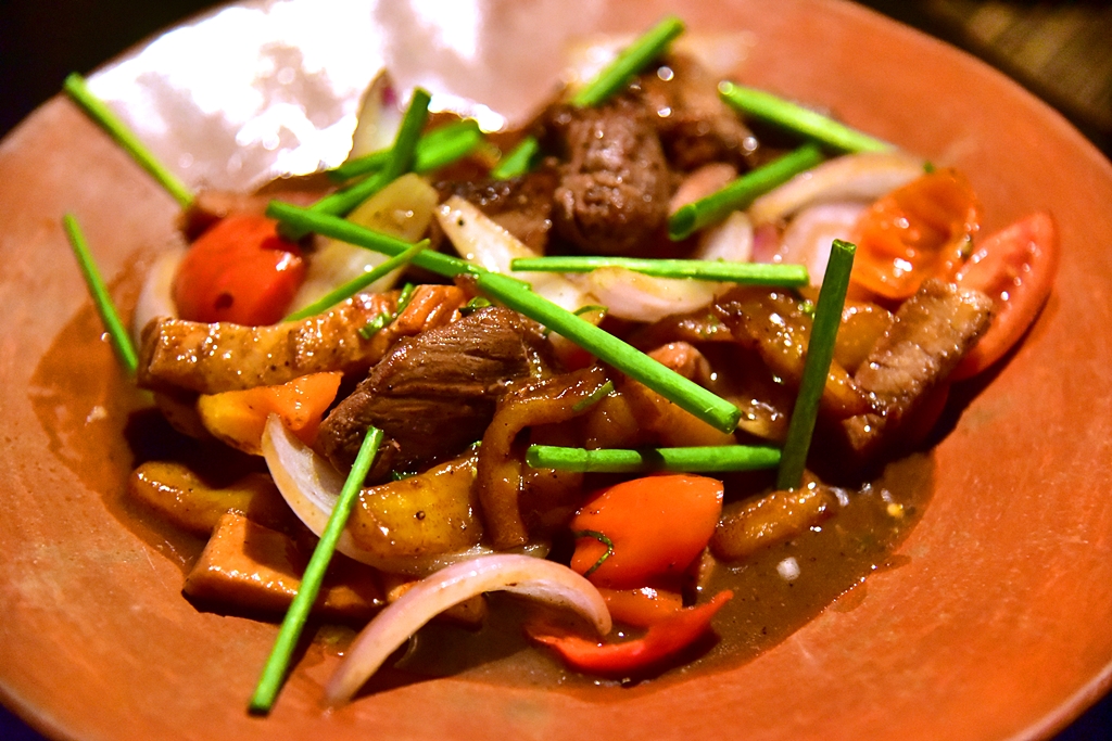 6. Classic Stir Fried Beef with Smoked Pork, Onions, Tomatoes, Sweet Chili Peppers and Refried Plantains (90 Sol) – เนื้อวัวย่างผัดกับเนื้อหมูรมควัน หอมหัวใหญ่ มะเขือเทศ พริกหวานและกล้วย