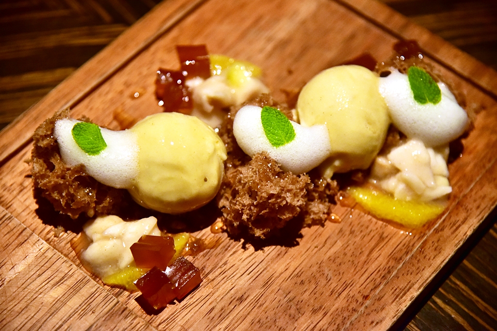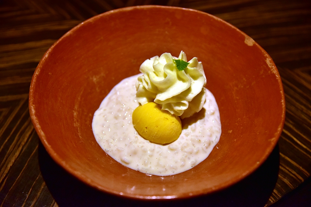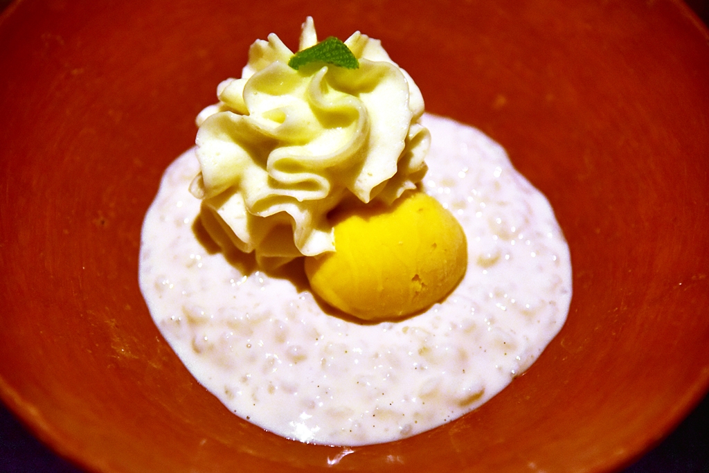 7. Coconut Rice and Mango Sorbet (35 Sol) – ข้าวเหนียวในซอสมะพร้าวเสิร์ฟคู่กับไอศกรีมมะม่วงและวิปครีม