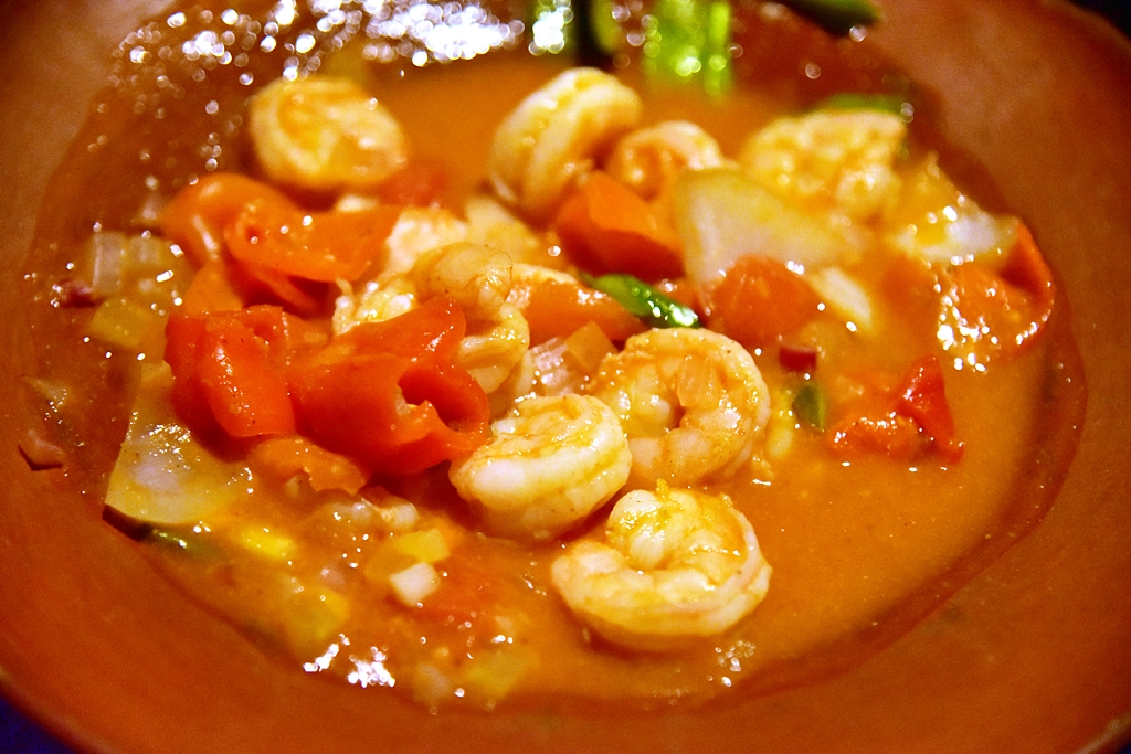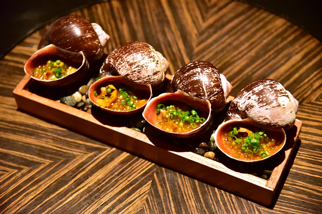 1. Wild Giant Amazonian Snails stewed with Turmeric, Chorizo and Spicy Chili Peppers (110 Sol) – สตูว์เนื้อหอยทากยักษ์จากป่าแอมะซอนหั่นเป็นชิ้นพอดีคำเสิร์ฟคู่กับไข่มุกแป้งมันสำปะหลังในซอสไส้กรอกโชริโซ่ ขมิ้นและพริกเปรู