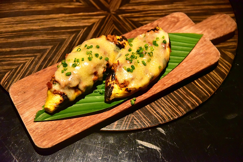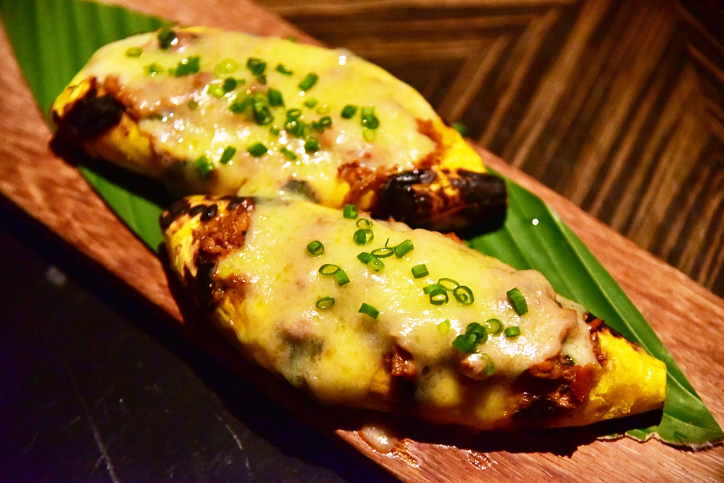3. Grilled Plantains filled with Fresh Cheese (65 Sol) – กล้วยโปะชีสและเนื้อสับปรุงรสอบจนเยิ้ม
