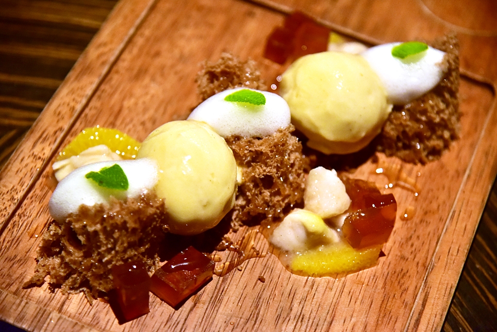 9. Lemon Mandarin, Citrus Sorbet, Amazonian Gin, Wild Honey Gelatin and Brazil Nut Sponge (35 Sol) – เค้กสปอนจ์ถั่วบราซิลเสิร์ฟคู่กับไอศกรีมส้ม เจลลี่ส้ม โฟมมะนาวและเหล้าจินจากป่าแอมะซอน