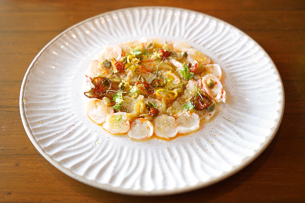 3. Prawn Carpaccio (640 THB) [14/20] – กุ้งลายเสือหั่นเป็นแว่นชิ้นบางเสิร์ฟแบบคาร์ปาชโช่พร้อมด้วยมะเขือเทศและมะเขือยาวน้ำมันเลม่อนปรุงรสแบบอ่อนๆสดชื่น เนื้อกุ้งเด้งหวานถือเป็นเมนูเด็ดประจำร้าน Antito