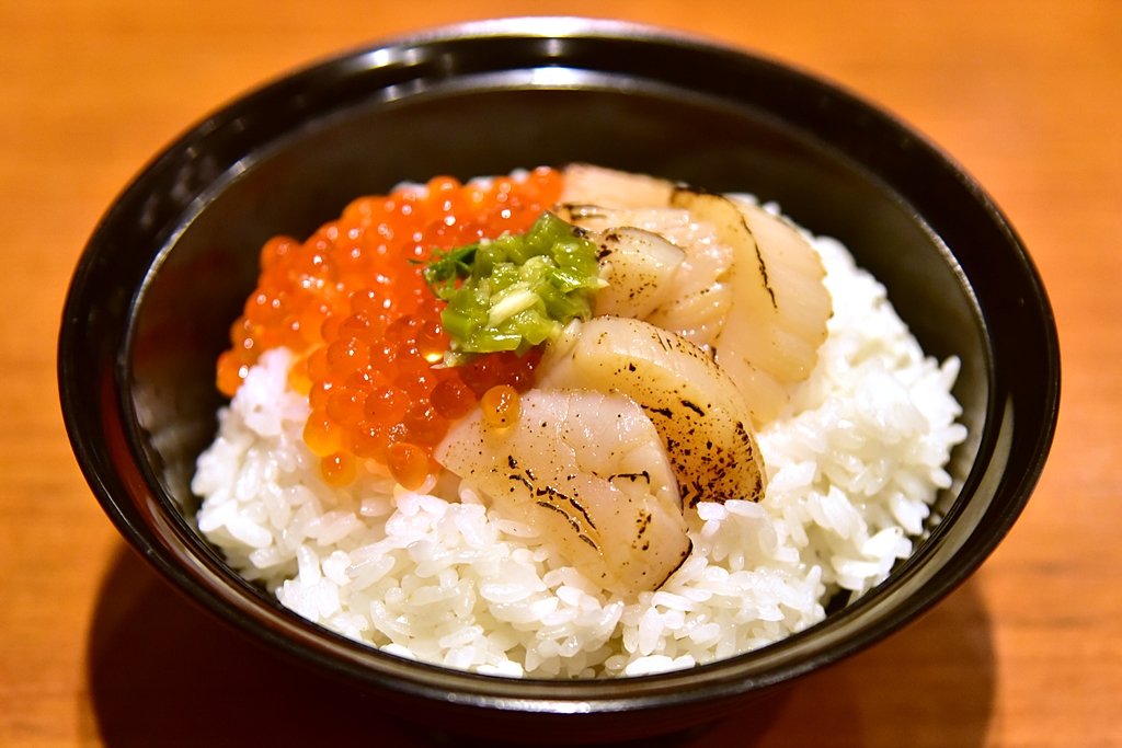 1. Aburi Hotate & Ikora Gohan (700++ THB) – ข้าวหน้าหอยเชลล์ฮอกไกโดเนื้อหวานสดพ่นไฟหอมๆโรยหน้าด้วยไข่ปลาแซลม่อน