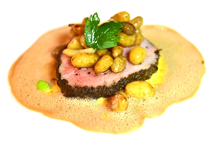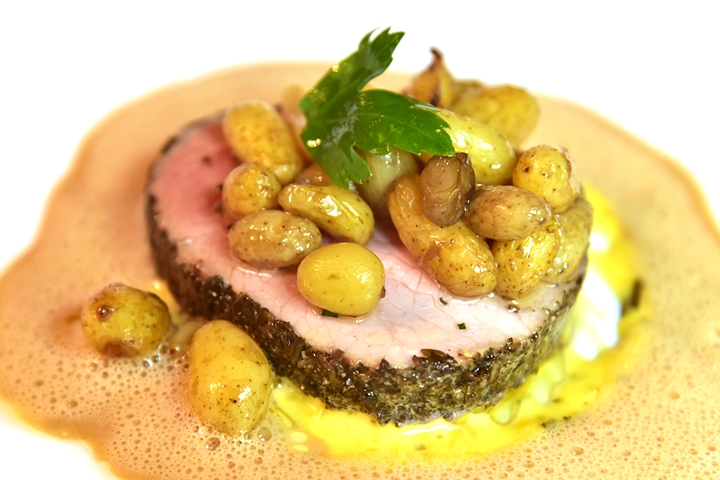 4th course: Mignon de Veau de lait au Thym et à la Menthe, Pommes de terre Grenailles – เนื้อลูกวัวนุ่มๆเสิร์ฟคู่กับมันฝรั่งนิวโพเตโต้และซอสครีมสมุนไพรรสกลมกล่อมหอมอร่อย