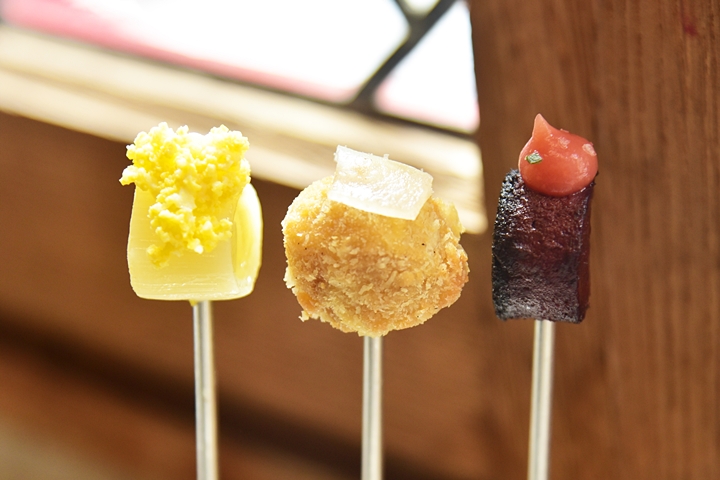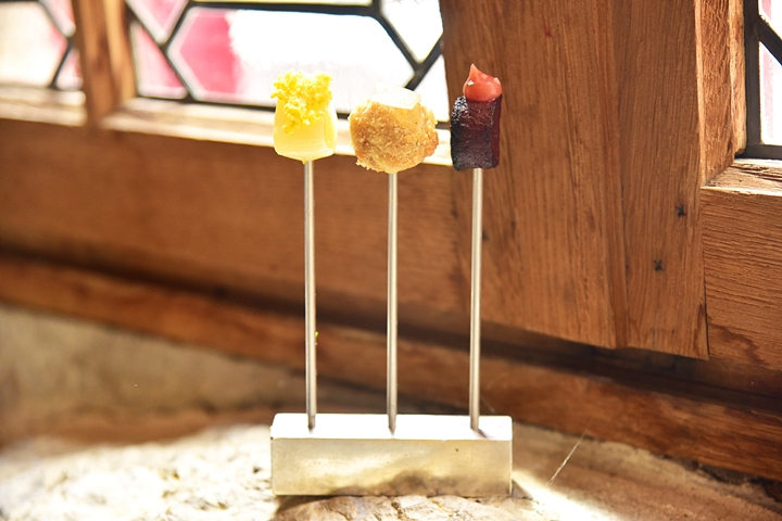 2nd course: Mise en Bouche – เมนูคำเล็กทั้งหมด 3 อย่าง ได้แก่ ต้นหอม คร็อกเก็ตไส้แฮมและพุดดิ้งเลือด