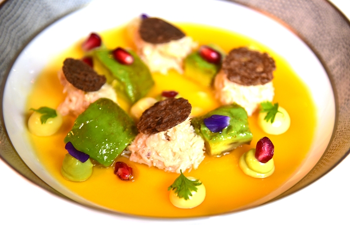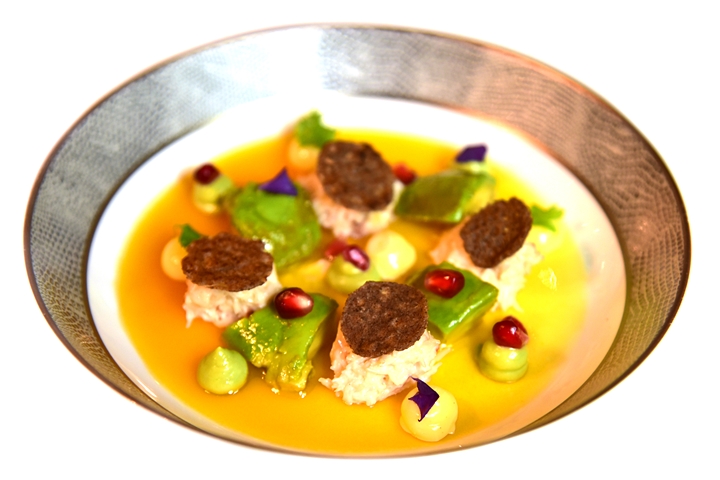 3rd course: Pinces de Tourteau de casier, fraîcheur de Citron vert, Avocat et Grenade – เนื้อปูรสหวานฉ่ำและอโวคาดาโด้เนื้อหวานมันวางบนครีมไซตรัสเล่นเปรี้ยวสดชื่น