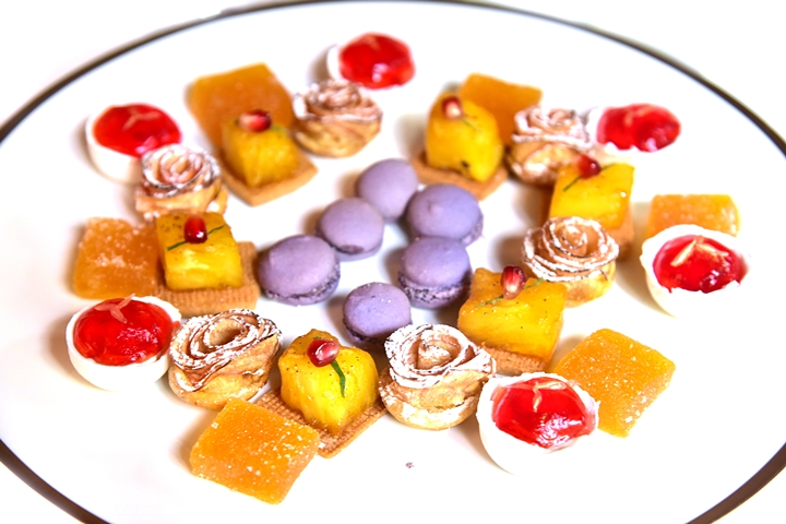 8th course: Mignardises – ขนมหวานชิ้นเล็กทั้งหมด 5 อย่าง ได้แก่ มาการอง พายสับปะรด พายแอปเปิ้ล เมอแรงค์ซอสสตรอเบอร์รีและเจลลี่เสาวรส