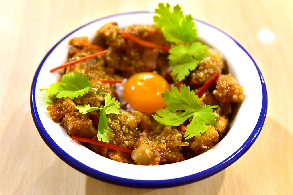 1. Stirred Crispy Pork Belly with Garlic and Chilli with Rice and Pickled Egg Yolk (159 THB) – ข้าวหน้าหมูกรอบคั่วพริกกระเทียมเสิร์ฟคู่ไข่ดองน้ำปลารสชาติจัดจ้านเข้ากันได้อย่างลงตัวมาก หมูกรอบกรอบเบาดีงาม