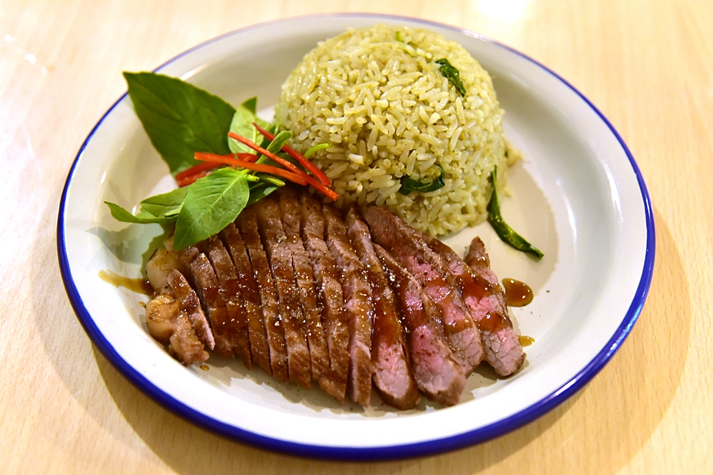 3. Thai-French Grilled Beef with Stir-fried Green Curry Rice (330 THB) – เนื้อโคขุนโพนยางคำย่างแบบมีเดียมเสิร์ฟคู่กับข้าวผัดแกงเขียวหวาน
