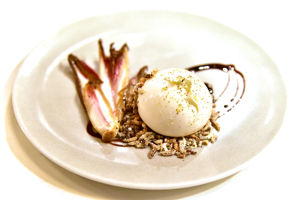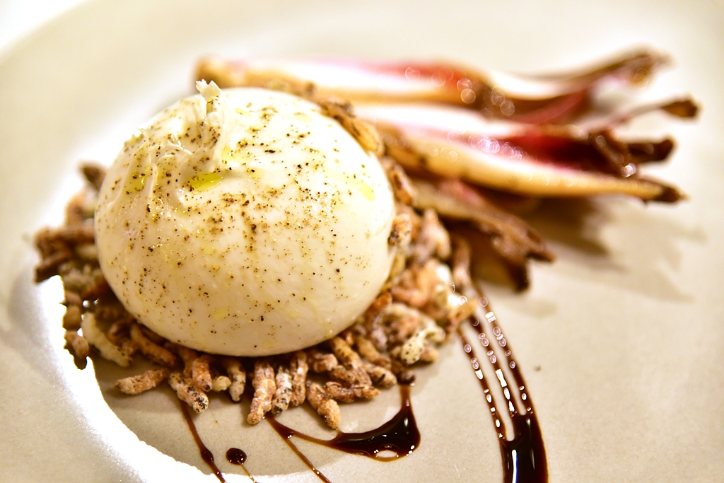1. Burrata, charred radicchio tardivo, 8 year balsamic, puffed wild rice (9.5 GBP) – บูราต้าชีสเนื้อนุ่มรสละมุนลิ้นเสิร์ฟคู่กับผักย่างและซอสบัลซามิคโรยหน้าด้วยข้าวพองกรอบ สั้นๆครับ “โคตรอร่อย” !!
