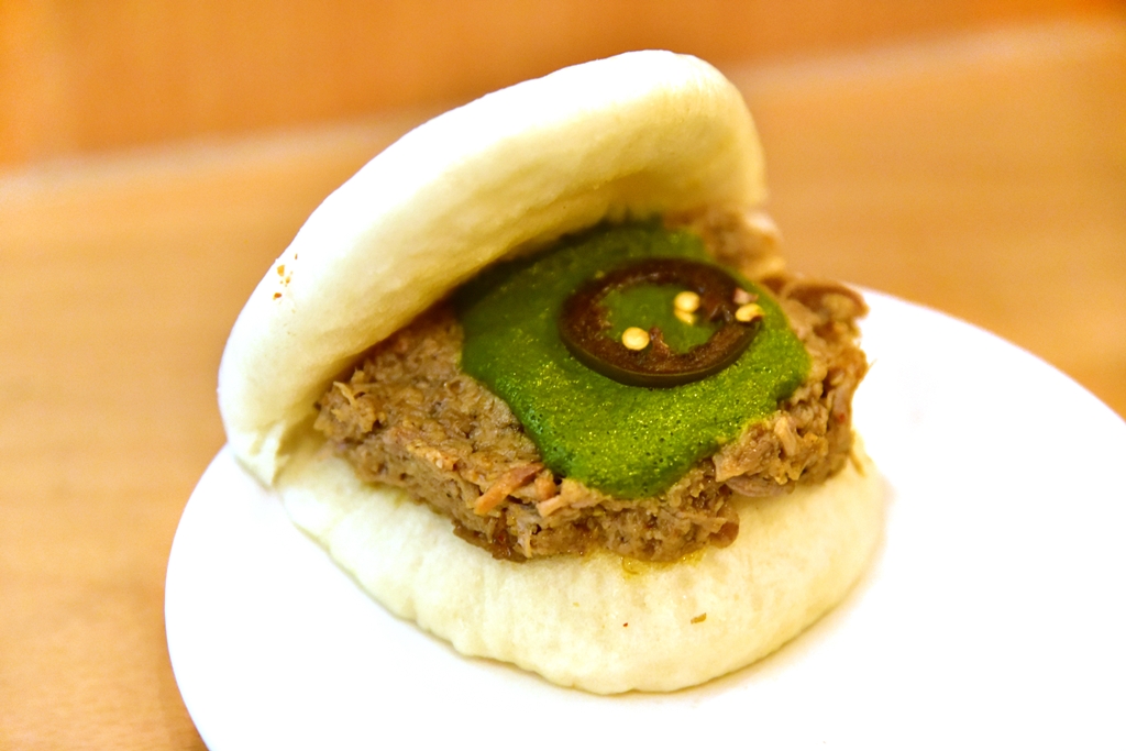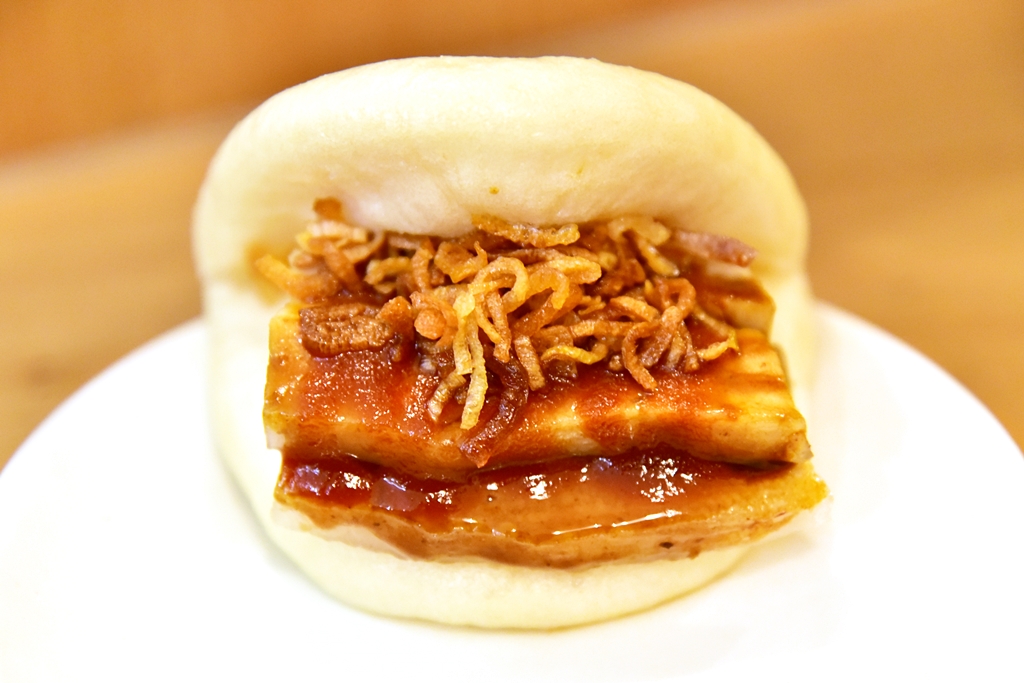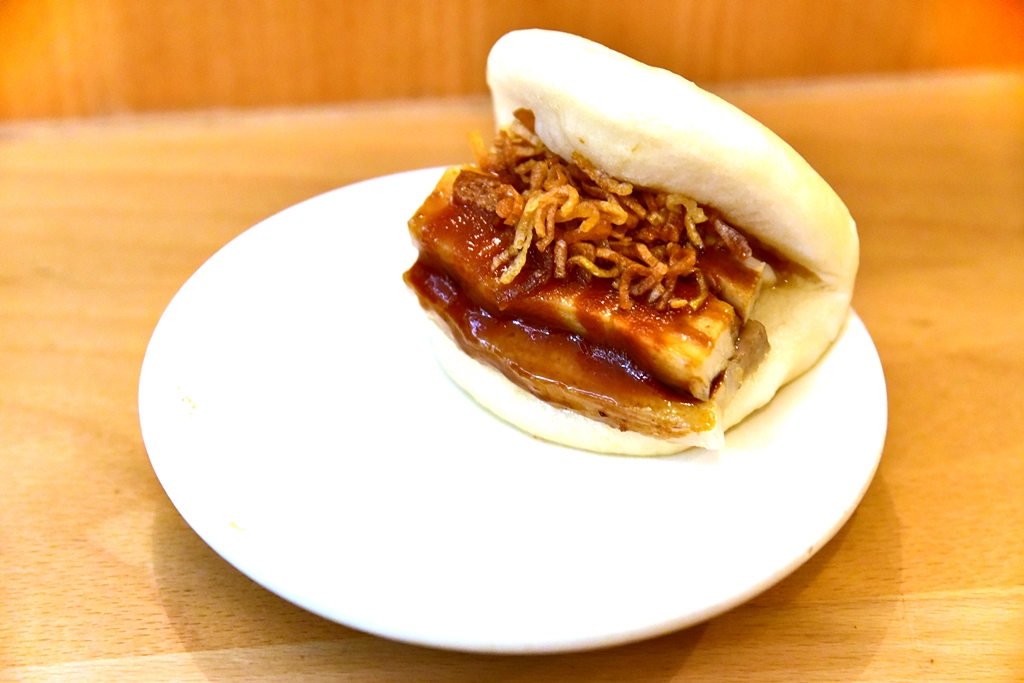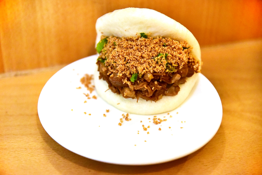 5. Confit Pork Bao (5+ GBP) – ซาลาเปาหมูสามชั้นตุ๋นราดฮอตซอสโรยหน้าด้วยหอมเจียวทอดกรอบ