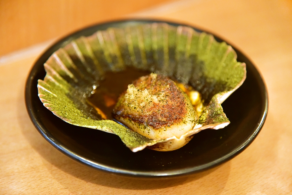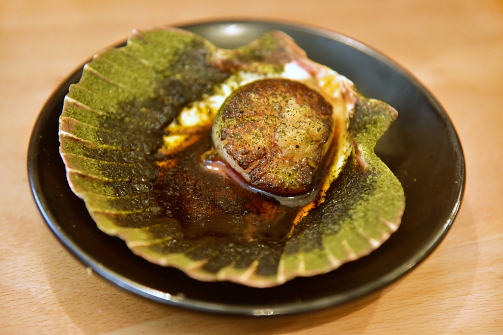 1. Scallop, Yellow Bean Garlic (4.5+ GBP) – หอยเชลล์ย่างได้หอมนุ่มกำลังดีบนซอสน้ำมันกระเทียมรสชาติเยี่ยม