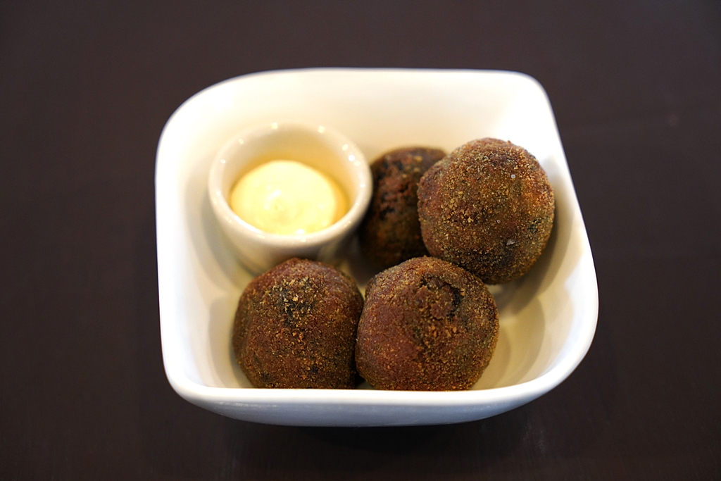 1. Seafood Croquette (95+ THB) [10/20] – คร็อกเก็ตสเปนไส้เกร็ดขนมปังผสมหมึกดำคลุกเคล้ากับเนื้อปลาหมึกและเนื้อกุ้ง