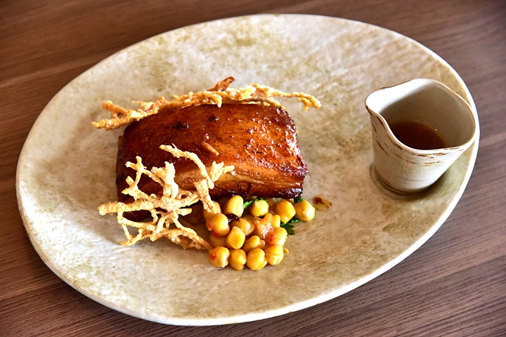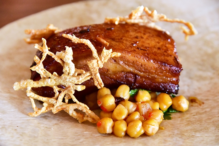 3. Pork Belly (590 THB) – หมูสามชั้นตุ๋นในซอสแอปเปิ้ลผสมขิงและเครื่องเทศจนเนื้อเปื่อยนุ่มเสิร์ฟคู่กับแคบหมูกรอบและถั่วชิคพี