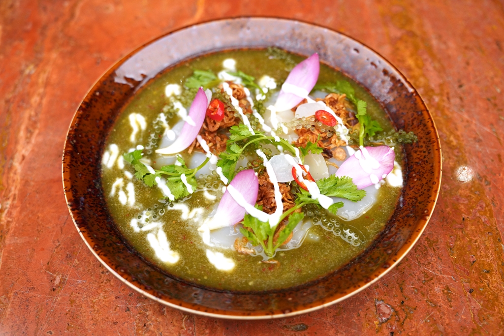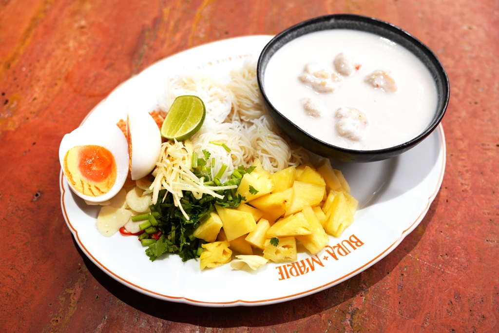 6. Thai Rice Noodle with Coconut Milk (320++ THB) [15/20] – “ขนมจีนซาวน้ำ” ที่เสิร์ฟขนมจีนกับน้ำกะทิหมูก้อนพร้อมด้วยสับปะรด กุ้งแห้งป่นและไข่ต้ม