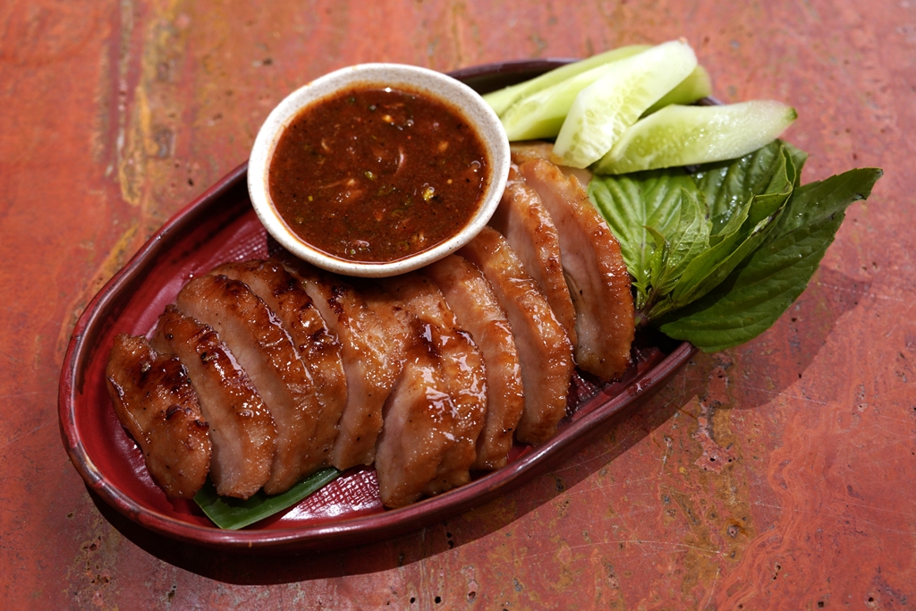 4. Grilled Pork Neck (330++ THB) [14/20] – คอหมูย่างแบบเนื้อเด้งเคลือบซอสหวานเสิร์ฟกับแจ่วและผัก