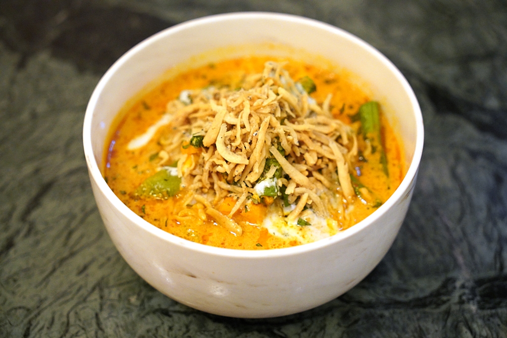 8th course : Kak Kway Masak Lemak, luffa melon with tiger prawn cooked in lemak sauce, glass noodles, long bean, Japanese tofu puff [13/20] – แกงบวบกับกุ้งลายเสือเสิร์ฟพร้อมกับถั่วยาว เต้าหู้ญี่ปุ่นและวุ้นเส้น