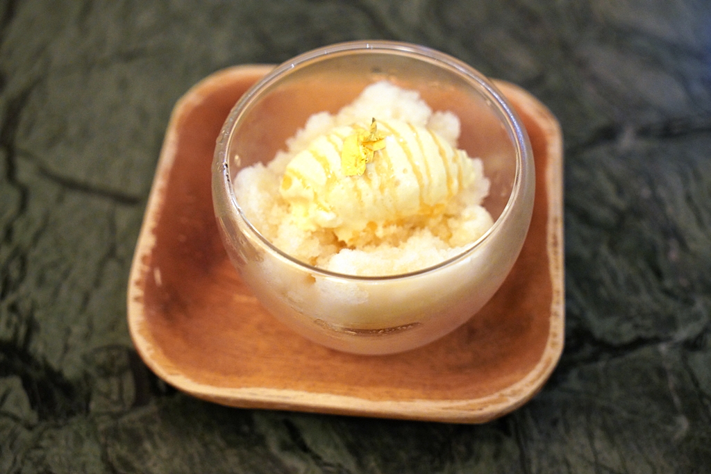11th course : Honey Ginger Apple, honey ginger ice cream, apple shaved ice, green apple curd, wild tea tree honey [13/20] – ไอศกรีมขิงผสมน้ำผึ้งเสิร์ฟพร้อมกับกรานิต้าแอปเปิ้ลและแอปเปิ้ลเคิร์ด