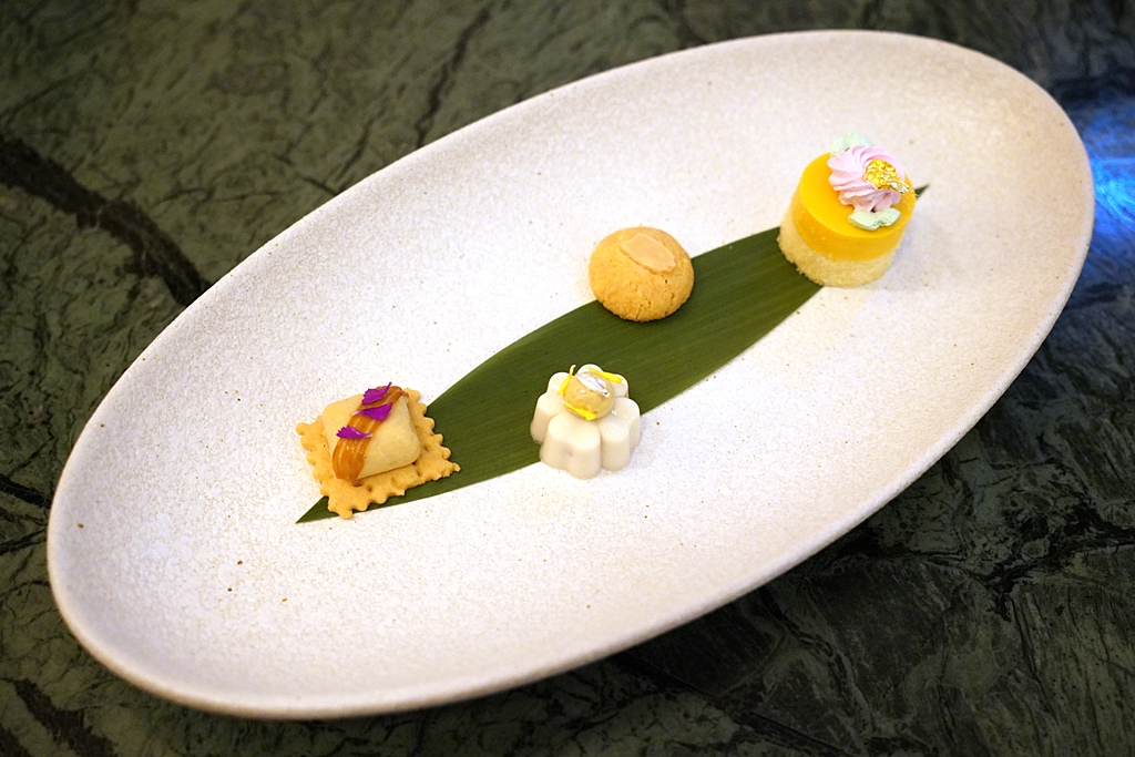 12th course : Gula Melaka Crème with Butter Crust, Pisang Agar-Agar, Semolina Cookie “Chinese Style” & “Old School” Mango Cake [14/20] – เมนูขนมหวานคำเล็กปิดท้ายมื้ออาหารที่ประกอบไปด้วยทาร์ตขนมน้ำตาลปี๊บ วุ้นกล้วยกับพิวรีกล้วย คุ้กกี้อัลมอนด์และเค้กมะม่วง